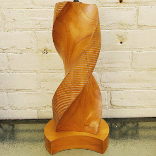 TWISTED MCM: Swipe to see more of this Exceptionally Rare Pair of Mid-Century Solid Maple Spiral Twist Lamps with Etched Horizontal Lines.